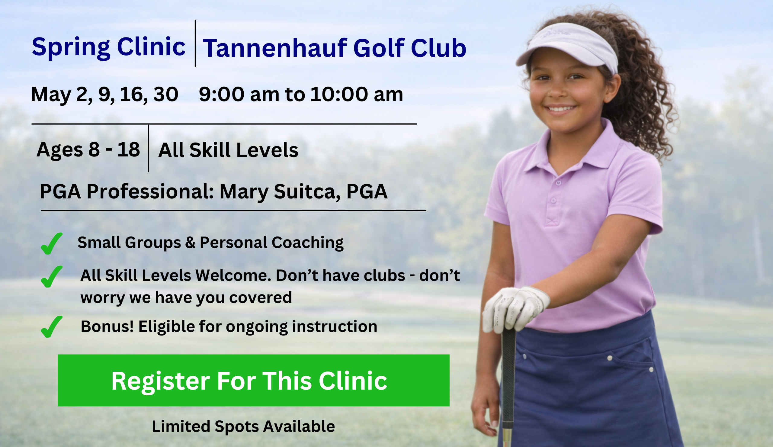 Whether your daughter is brand new to golf or getting ready for school teams and summer tournaments, Spring Clinics provide personalized instruction, positive mentorship, and a welcoming place to grow her game. All skill levels are welcome, and equipment is available upon request — just bring enthusiasm and a smile!